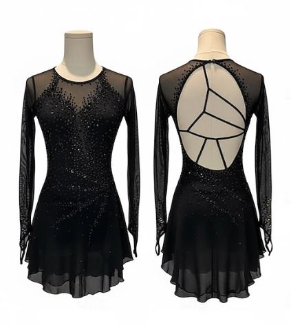 Modell NOXIA ist ein edles Eiskunstlaufkleid in tiefem Schwarz mit feinem Glitzer, der bei jeder Bewegung dezent im Licht schimmert. Der elastische, figurbetonte Stoff sorgt für eine perfekte Passform und volle Bewegungsfreiheit auf dem Eis.